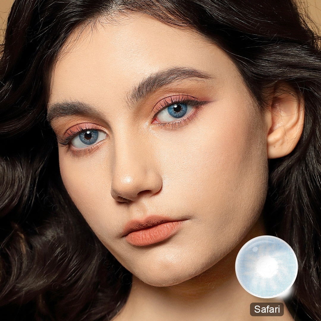 These Safari Blue Colored Contacts feature a mix of ice blue and icy gray for a simple but advanced design. In spite of the lens use of cool tones, they could perfectly cover and blend with your original eye, creating a hazy finish just like a piece of silk chiffon. No inner or outer rings, meaning no harsh borders and realistic irises, providing a natural hazy look.